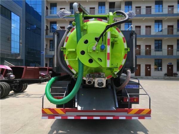 吸污部分:9方污罐,罐體8mmQ235優質碳鋼板制作,配淄博SK-15(可選裝2BE-204)水循環泵抽污吸力大,10米吸污管一根,進氣管加過濾網,防溢閥加高,后蓋卡扣鎖緊,前視污亮管,后尾部加裝1個力拓牌**mm的吸污口球閥和150mm排污口(部分地區可根據情況可另行加裝TP),罐體帶舉升功能,后門帶液壓開啟。罐體頂部360°旋轉吊桿,可遙控操作省時方便。