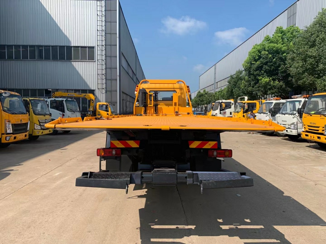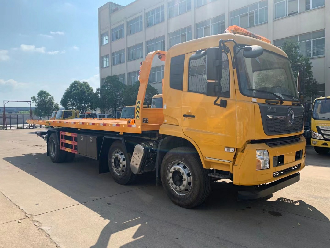 上裝配置:12噸上裝,尾部翻轉1.2米,平板總長8.3米,寬2.55米,5個厚的花紋板,邊框16mm鋼板,加厚雙副梁,后托主梁承載12噸3節,10噸液壓卷盤一個,拖車拖叉座一對,L型抱胎架一個,輪胎擋板2個,**小輪2個,綁帶4根。