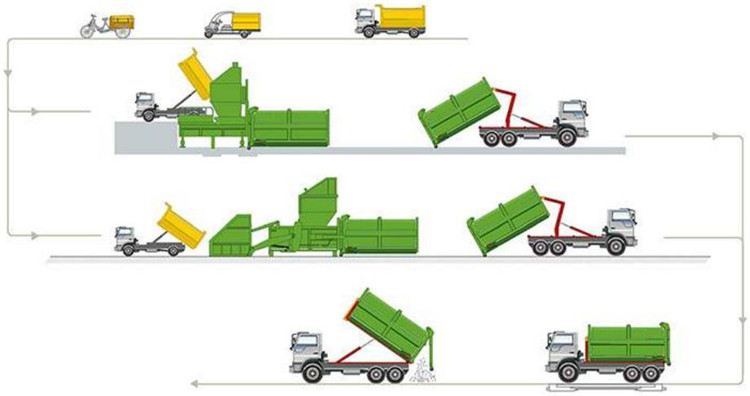 分體式垃圾壓縮設備由壓縮頭、壓縮腔、閘門升降機構(gòu)、推拉箱裝置、液壓鎖緊裝置、頂棚料斗機構(gòu)、液壓系統(tǒng)、電器**系統(tǒng)和環(huán)衛(wèi)箱(可選加配移箱機構(gòu)、后翻轉(zhuǎn)上料機構(gòu)、側(cè)翻轉(zhuǎn)上料機構(gòu)、降塵噴霧系統(tǒng)、高壓清洗系統(tǒng)、****系統(tǒng)等)。