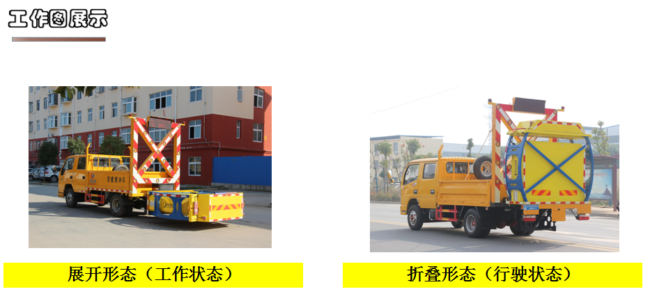 采用Q235國標邊3mm底板花紋板4mm厚,箱體后部防撞緩沖模塊包采用國際知名技術產品80K防撞緩 沖模塊,防撞緩沖吸能模塊主要由車載防撞緩沖墊和導向標志架組成,充當施工作業車輛后方的緩沖衛士。 如若發生追尾事故,能夠在肇事車輛和前方施工作業區域之間構建一個緩沖區域,通過機具結構變形吸收撞 擊的能量,**限度地降低被保護人員及設備遭到碰撞的幾率。高性能液壓系統,可實現快速舉升和落下操 作,方便設備運輸轉場,一鍵啟動功能,舉升和落下防撞裝置,當防撞裝置未完全落下到工作位置或舉升到 垂直運輸位置時,會有自動**告音提示。